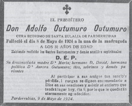 En la segunda de las fotos vemos a un don Adolfo muy delgado y con mala cara, indicio claro que la enfermedad le estaba ganando la batalla. Tal es así, que solo cinco meses y medio después de publicarse esa foto, el 8 de mayo de 1924, fallece en su casa de O Outeiro a los 33 años de edad a causa de la tuberculosis. Su esquela fue publicada en diferentes diarios de la época. Fue enterrado en el cementerio parroquial de Parderrubias el 9 de mayo por don Alfonso Losada, siendo testigos de su entierro el sacristán Francisco Seara y Manuel Garrido (O Escultor). En Soutomandrás, el 22 de febrero de ese mismo año, había fallecido “o tío vello” a la edad de 54 años, poniéndose de esta manera, con solo dos meses de diferencia, el punto y final a dos vidas consagradas a Dios y al prójimo.